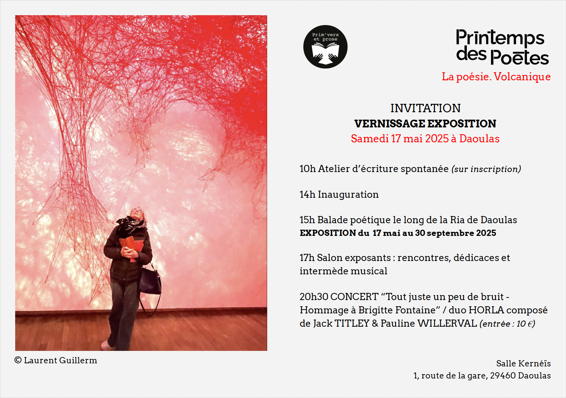 Invitation au vernissage '' La poésie. Volcanique'' à l'occasion du "Printemps des Poètes", le samedi 17 mai à Daoulas (29), salle Kernéïs et le long de la ria.