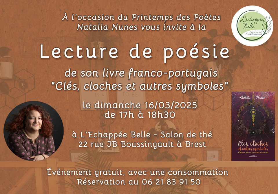 C'est avec joie que je vous invite à participer à ma prochaine lecture de poésie à L'Echappée Belle - Salon de thé à Brest le dimanche 16 mars à 17h.